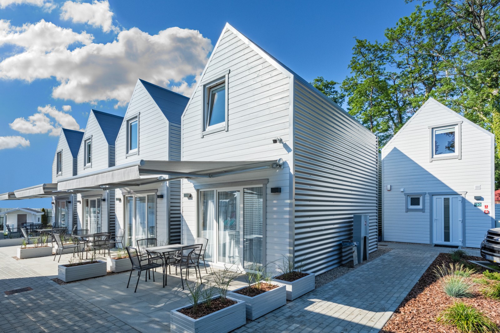 We have prepared 30 cosy storied houses, each one for 4-6 guests. These are wooden “tiny houses”, each one being furnished comfortably and creatively: two separate bedrooms on the first floor, a bathroom, kitchenette, and spacious living room with the access to the deck and garden furniture on the ground floor. Houses are equipped with boilers for hot water and air-conditioning.